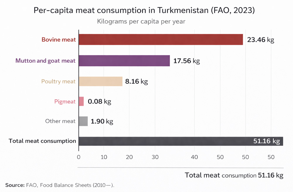 According to the most recent Food and Agriculture Organization of the United Nations (FAO) 2023 dataset, Turkmenistan has consumed roughly 51,16 kg of total meat per person annually, with bovine meat about 23,46 kg, sheep/goat meat around 17,56 kg, and poultry of only 8,16 kg forming the core of intake, alongside smaller quantities of pig meat of only 0.08 kg.