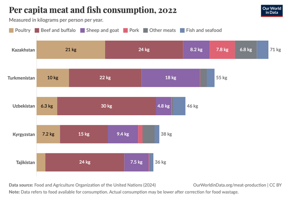 Our World in Data findings from 1992 to 2023 reveal that bovine, mutton, and goat meat dominate, accounting for half of consumption in Turkmenistan. In 2022, Turkmenistan consumed 55kg of meat per person, including fish, placing it second after Kazakhstan; however, per capita consumption has since decreased.