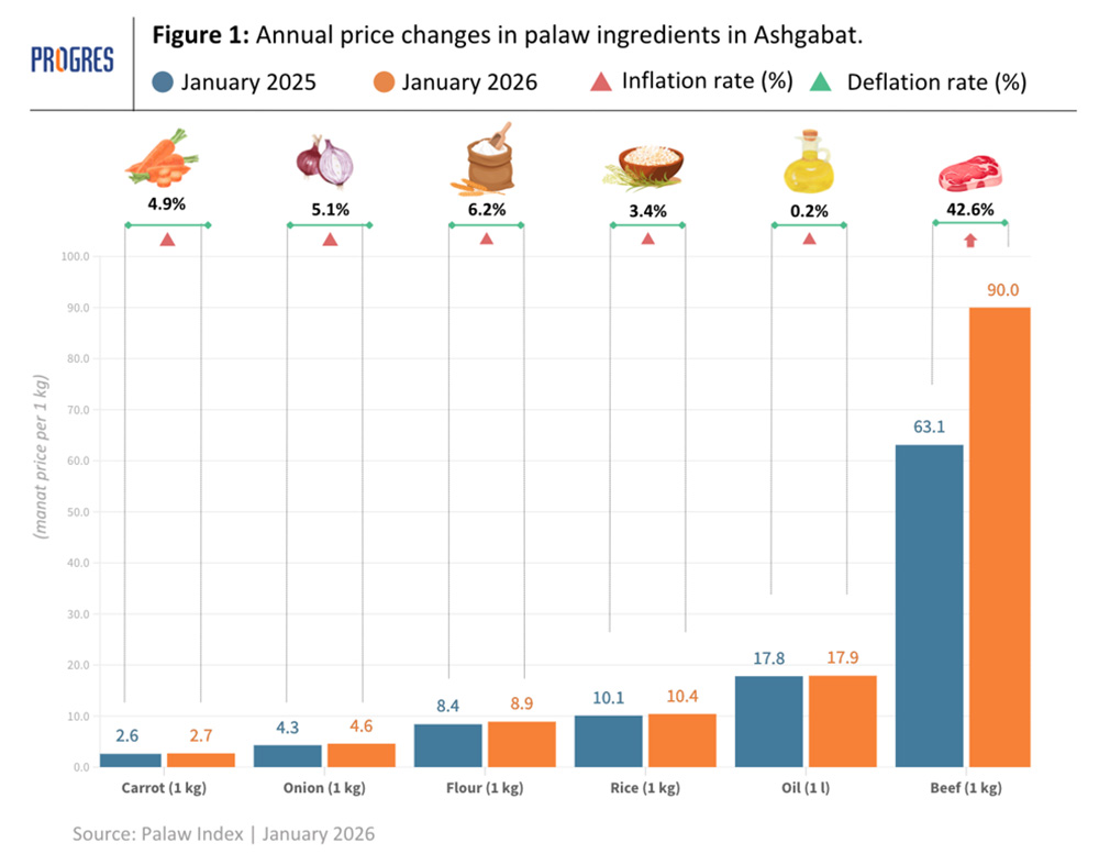 In January 2026, the average cost of preparing palaw in Ashgabat rose to 79.3 Turkmen manat, representing a 27.3% increase from 62.3 manat in January 2025. This sharp year-on-year rise was driven primarily by higher meat prices. On a month-on-month basis, however, the cost declined by 5.5% compared with December 2025, when palaw preparation averaged 83.9 manat. This local trend diverges from global developments, as the FAO’s Food Price Index registered a 0.6% year-on-year decrease.