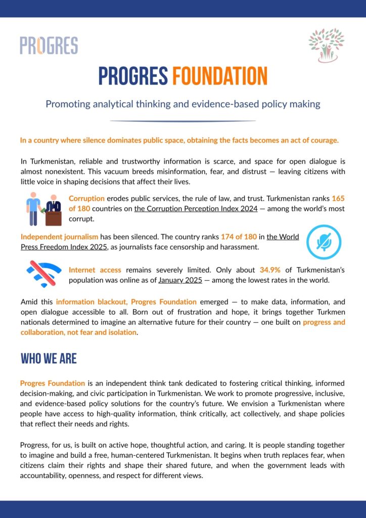 Progres Foundation (“Progres” with one “s” as in the Turkmen language) is a non-profit organization based in the United States that supports various progressive initiatives that contribute to understanding of social realities and to shaping a new vision and approaches to sustainable human development in Turkmenistan. Progres Foundation’s activities consist primarily of informing and educating the public in Turkmenistan with an emphasis on free access to information and critical thinking by engaging with Turkmen nationals around the world.