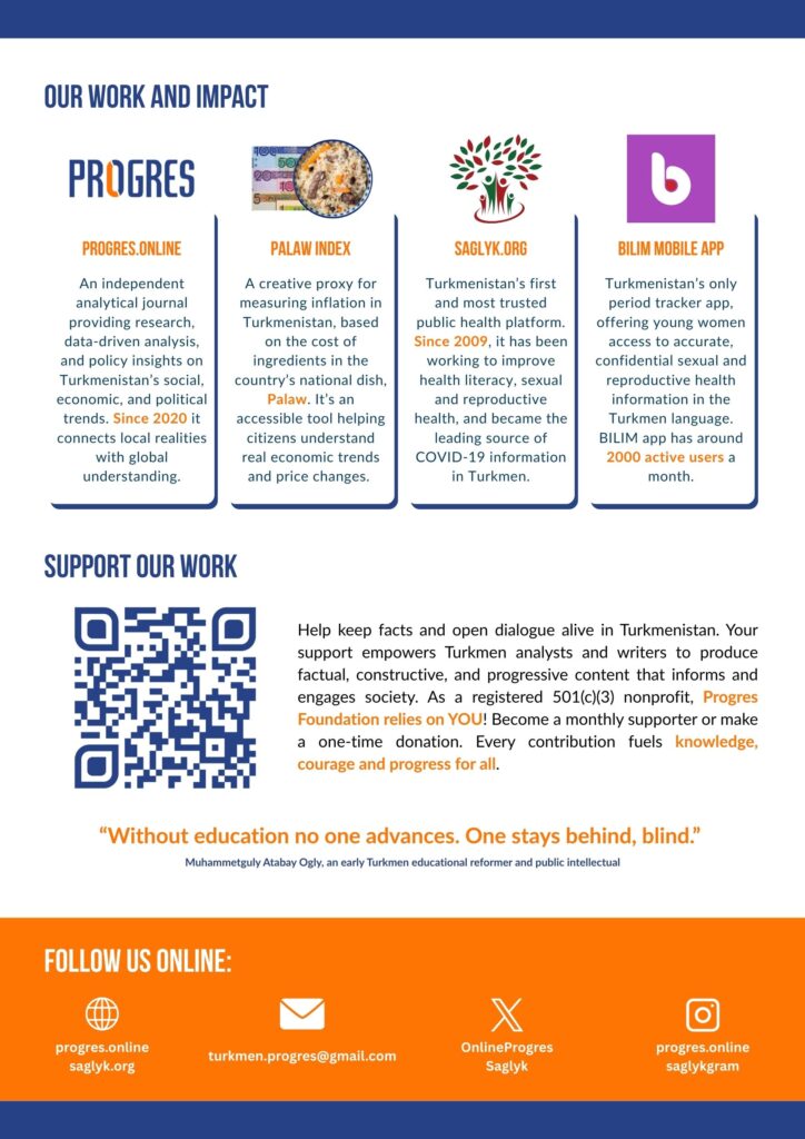 There are two flagship informational portals established by Progres Foundation. Saglyk.org has been working to improve public health literacy in Turkmenistan over the last 12 years, including becoming a leading source of COVID-19 information in the Turkmen language.Progres.online is an online analytical journal that promotes nuanced understanding of the societal trends in Turkmenistan by providing quality research and policy analysis. Progres.online was launched in June 2020. Our content reaches the public in Turkmenistan and Turkmen diaspora around the world.