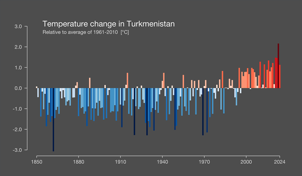 Central Asia is expected to warm at a rate faster than the global average, with temperatures projected to rise by 1.5-2.4°C. This warming trend is already evident in Turkmenistan, where temperatures have increased by over 1°C in the past 20 years, as seen in the figure below.