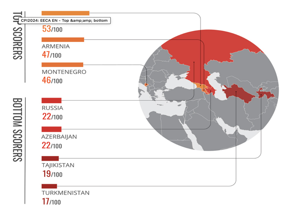 According to the Transparency International, corruption continues to flourish across Eastern Europe and Central Asian countries due to weak democratic institutions and the rule of law, which is further eroded by inadequate laws governing political financing, lobbying disclosure, and transparency of beneficial ownership. Currently, the region’s average score remains one of the lowest globally on the 2024 CPI at 35 out of 100.