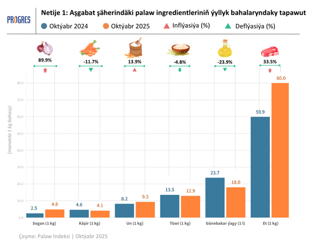 2025-nji ýylyň oktýabrynda palaw taýýarlamak üçin gerekli käbir önümleriň bahasy pese gaçsa-da, beýlekileriňki ep-esli ýokarlandy. Günebakar ýagynyň bahasy degişli döwürde 23.9% peseldi. Şeýle hem, käşiriň bahasy -11.7% we tüwi 4.8% arzanlady. Emma beýleki önümler gymmatlady: sogan 89.9%, sygyr eti 33.5% we bugdaý ununyň bahasy 13.9% ýokarlandy (Netije 1-e serediň).